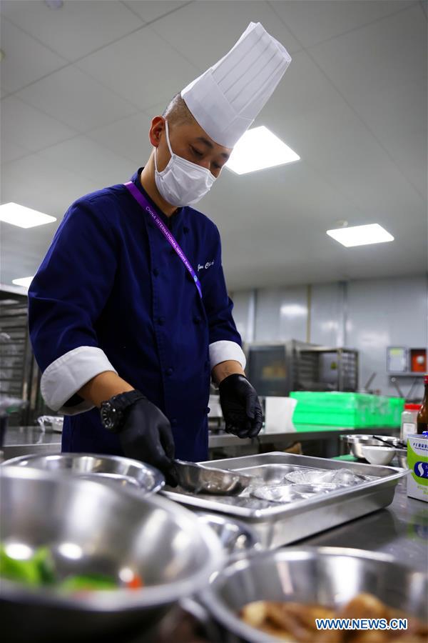 A chef prepares food at the kitchen during the third China International Import Expo (CIIE) in Shanghai, east China, Nov. 5, 2020. Staff members of different occupations stick to their posts during the 3rd CIIE to ensure the smooth progress of all links. (Xinhua/Lu Ye)