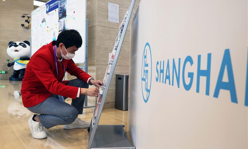 Volunteer Gu Hang arranges newspapers at the Media Center of the third China International Import Expo (CIIE) in Shanghai, east China, Nov. 4, 2020. Staff members of different occupations stick to their posts during the 3rd CIIE to ensure the smooth progress of all links. (Xinhua/Lu Ye)