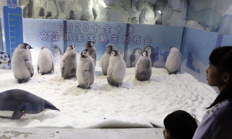 Visitors view baby emperor penguins at Chimelong Ocean Kingdom in Zhuhai, south China's Guangdong Province, Nov. 8, 2020. Ten baby emperor penguins born from June to August this year made their debut here on Sunday. In recent five years, a total of 36 emperor penguins were born in the Chimelong Ocean Kingdom. (Xinhua/Huang Guobao)
