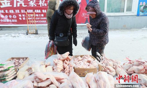 Frozen foods are sold on the streets of Mohe City. (Photo: Chinanews.com)