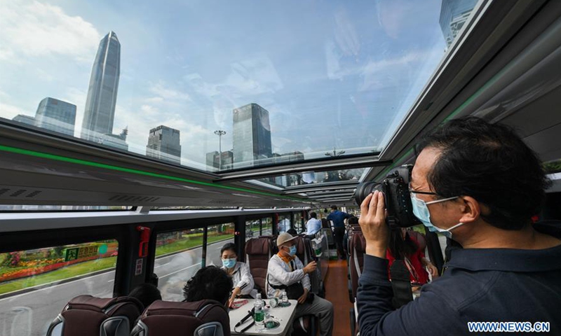 A journalist takes photos in a sightseeing bus in Shenzhen, south China's Guangdong Province, Oct. 22, 2020. Shenzhen on Thursday launched three sightseeing bus lines for tourists, which respectively showcase the culture, technology and night view of the city.Photo:Xinhua