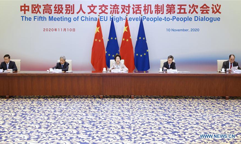 The fifth meeting of the China-EU high-level people-to-people dialogue is held via video link on Nov. 10, 2020. Chinese Vice Premier Sun Chunlan and Mariya Gabriel, European Commissioner for Innovation, Research, Culture, Education and Youth, attended the meeting. (Xinhua/Liu Bin)