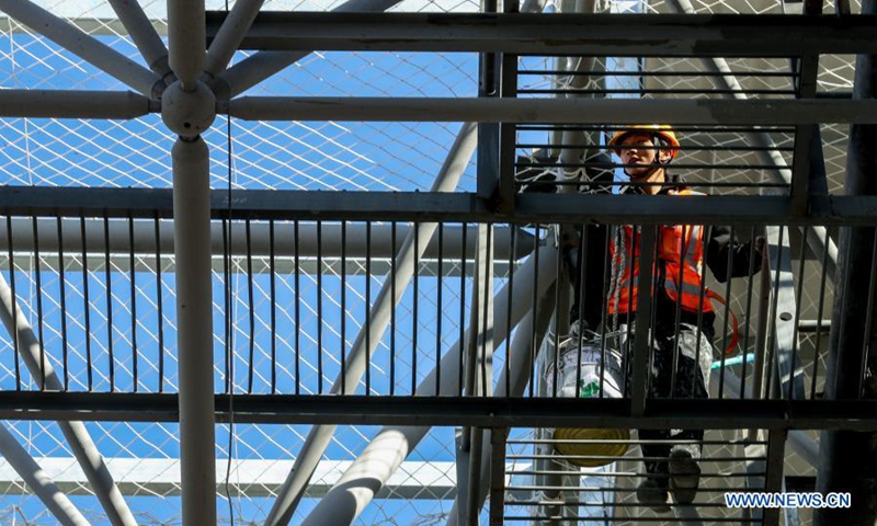 A worker of China Construction Third Engineering Bureau Co., Ltd. works at the construction site of the Guiyang Longdongbao International Airport in Guiyang, southwest China's Guizhou Province, Nov. 11, 2020. The main structure of the Terminal 3 project of Guiyang Longdongbao International Airport was announced to be completed on Wednesday. The total investment of the third-phase expansion project of Guiyang Longdongbao International Airport was about 20 billion yuan (about 3.03 billion U.S. dollars) and was scheduled to be placed in operation in 2021. (Xinhua/Ou Dongqu)