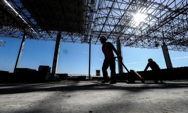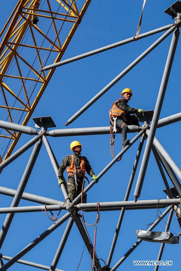 Workers of China Construction Third Engineering Bureau Co., Ltd. work at the construction site of the Guiyang Longdongbao International Airport in Guiyang, southwest China's Guizhou Province, Nov. 11, 2020. The main structure of the Terminal 3 project of Guiyang Longdongbao International Airport was announced to be completed on Wednesday. The total investment of the third-phase expansion project of Guiyang Longdongbao International Airport was about 20 billion yuan (about 3.03 billion U.S. dollars) and was scheduled to be placed in operation in 2021. (Xinhua/Ou Dongqu)