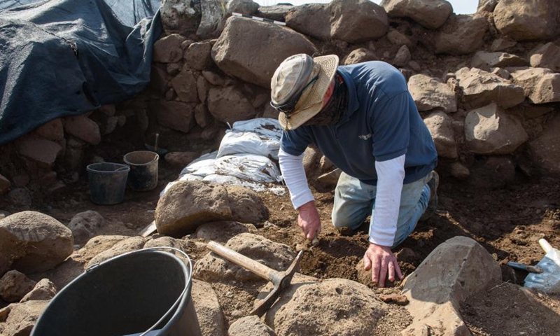 An archaeologist works at a 3,000-year-old fortified building in the Israeli-annexed Golan Heights, on Nov. 11, 2020. Israeli archaeologists have discovered a 3,000-year-old fortified building, the Israel Antiquities Authority (IAA) said on Wednesday. The rare fort was uncovered during an archaeological excavation led by the IAA at a small hill in the Israeli-annexed Golan Heights. (Ayal Margolin/JINI via Xinhua)