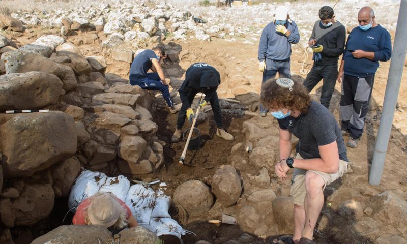 Archaeologists work at a 3,000-year-old fortified building in the Israeli-annexed Golan Heights, on Nov. 11, 2020. Israeli archaeologists have discovered a 3,000-year-old fortified building, the Israel Antiquities Authority (IAA) said on Wednesday. The rare fort was uncovered during an archaeological excavation led by the IAA at a small hill in the Israeli-annexed Golan Heights. (Ayal Margolin/JINI via Xinhua)