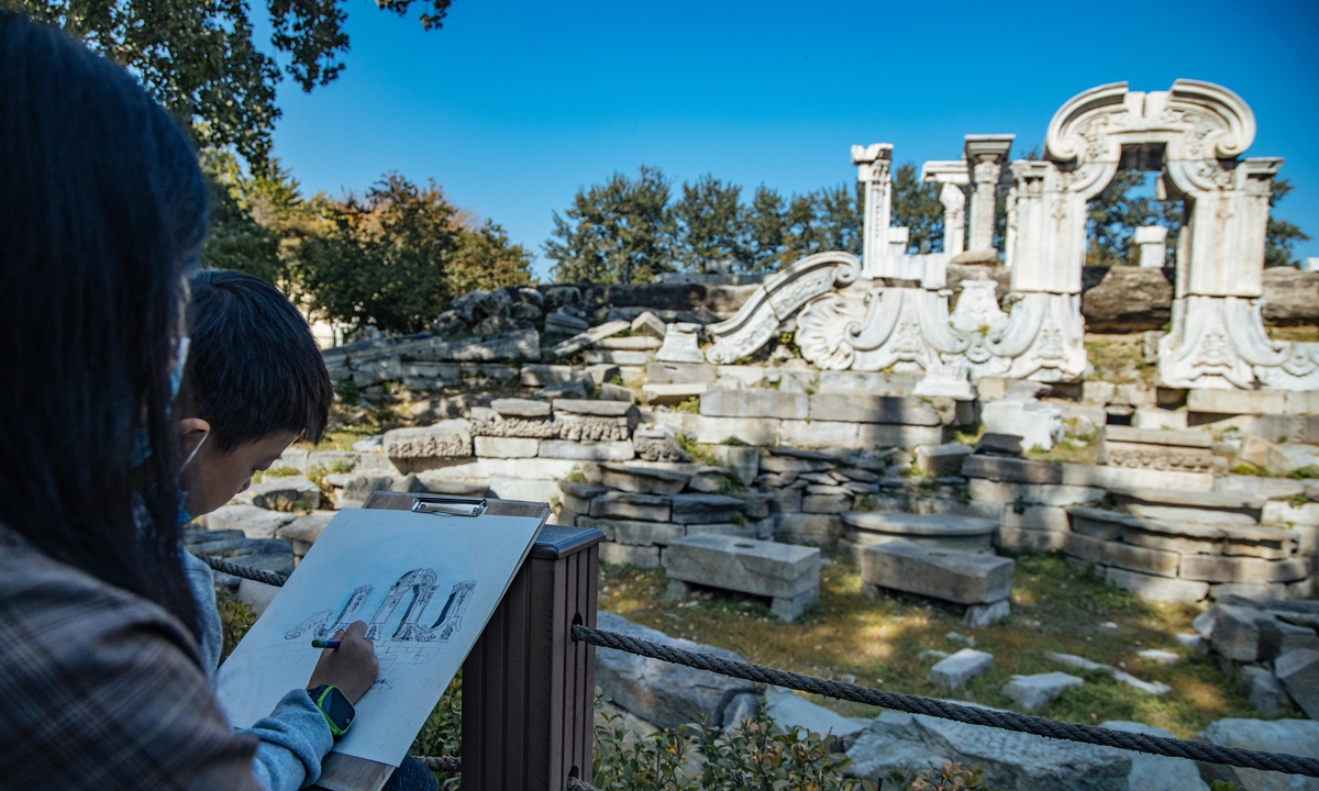 A tourist sketches the ruins of the Old Summer Palace at the Yuanmingyuan Ruins Park on Sunday. The park in Beijing opened free of charge on Sunday to commemorate the 160th anniversary of the massive looting and destruction of the palace carried out by the Anglo-French Alliance Forces in 1860. Photo: Li Hao/GT