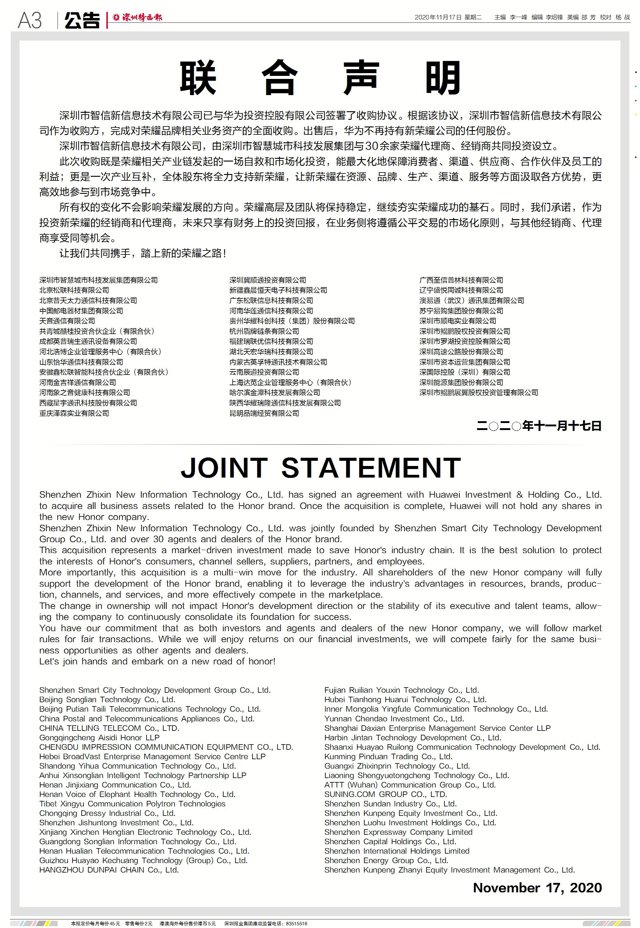 The buyers of Honor are led by Shenzhen Zhixin New Information Technology Co, jointly founded by state-owned Shenzhen Smart City Technology Development Group Co, in addition to Huawei's other long-term agents and dealers along its industrial chain, including Beijing Songlian Technology Co.