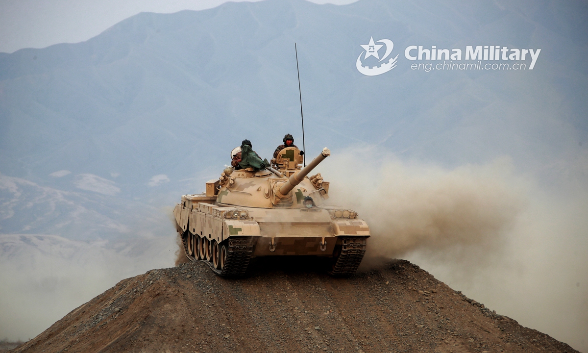A main battle tank attached to an armored detachment with a regiment under the PLA Xinjiang Military Command rumbles down from a sidehill during a driving skills training exercise on November 9, 2020. (eng.chinamil.com.cn/Photo by Yuan Kai)