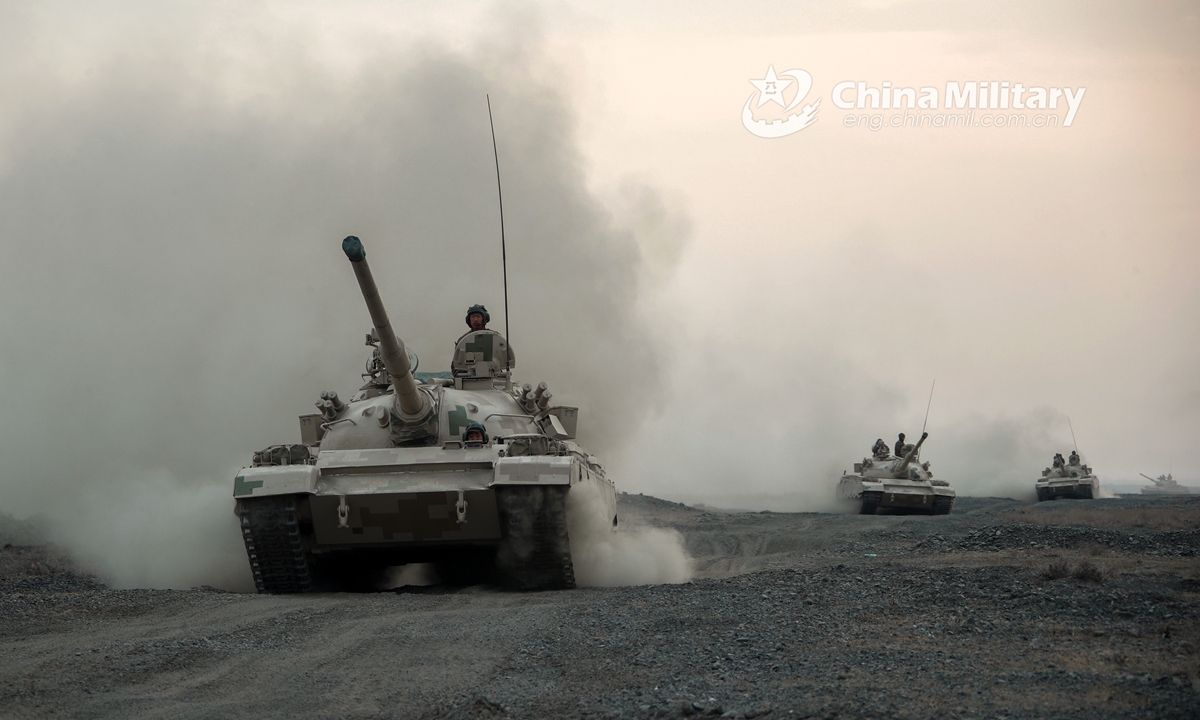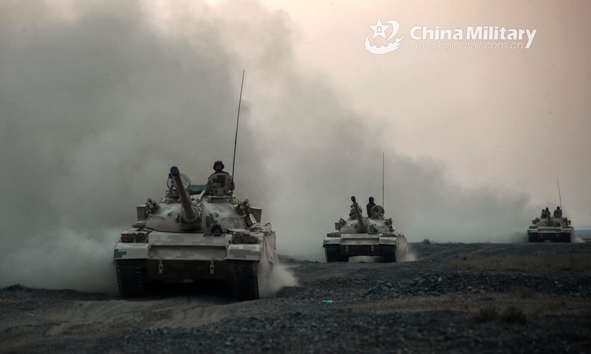 A group of main battle tanks attached to an armored detachment with a regiment under the PLA Xinjiang Military Command rumble on a cobblestone path in formation during a driving skills training exercise on November 9, 2020. (eng.chinamil.com.cn/Photo by Yuan Kai)