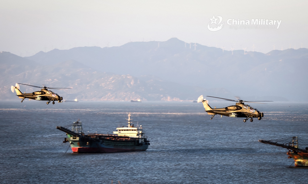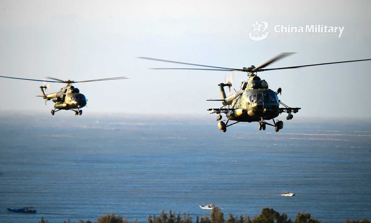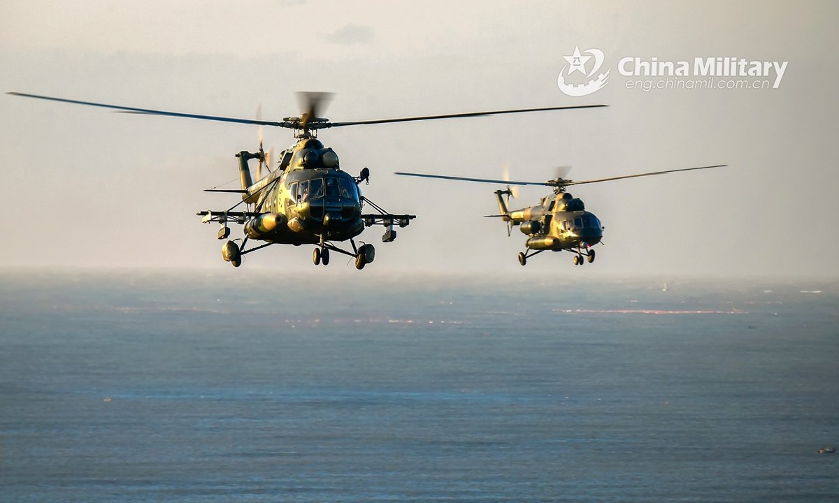 Two transport helicopters attached to an army aviation brigade under the PLA 73rd Group Army hover above the sea during a penetrating flight training exercise on November 11, 2020. (eng.chinamil.com.cn/Photo by Li Shilong)