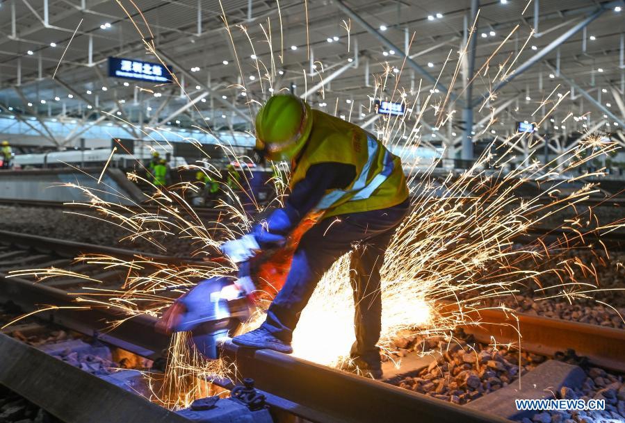 Workers are busy at the reconstruction site of the Shenzhen North Railway Station in Shenzhen, south China's Guangdong Province, Nov. 21, 2020. The reconstruction of the Shenzhen North Railway Station has entered its final phase since Saturday, and is expected to be finished by early December. The reconstruction work advances as the original railway station operates as usual, with construction workers on duty between 0:30 a.m. and 4:30 a.m. (Xinhua/Liu Dawei)