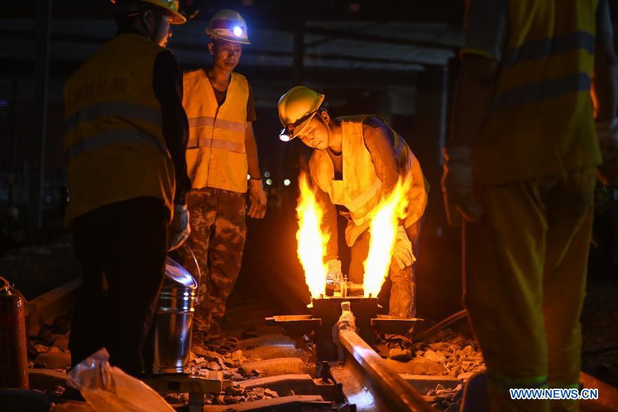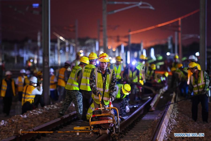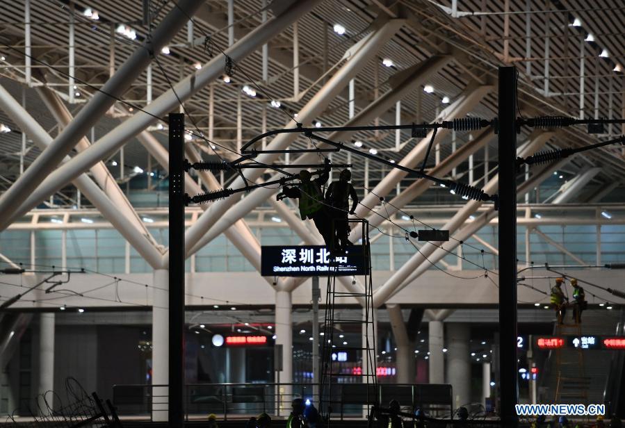 Workers renovate overhead contact system at the reconstruction site of the Shenzhen North Railway Station in Shenzhen, south China's Guangdong Province, Nov. 21, 2020. The reconstruction of the Shenzhen North Railway Station has entered its final phase since Saturday, and is expected to be finished by early December. The reconstruction work advances as the original railway station operates as usual, with construction workers on duty between 0:30 a.m. and 4:30 a.m. (Xinhua/Liu Dawei)