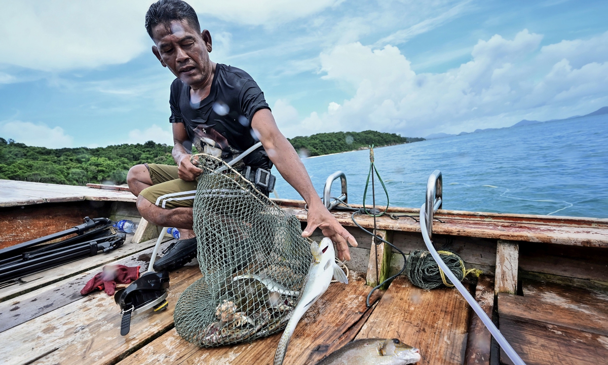 Moken fisherman Sanam Changnam shows his daily catch of fish off the coast. Photos: AFP
