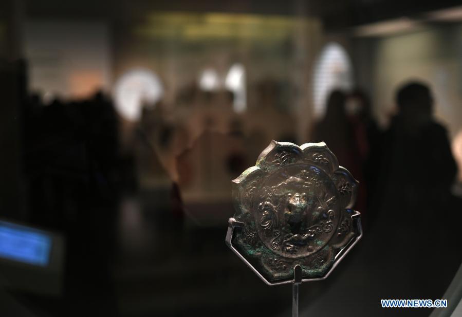 Photo taken on Nov. 24, 2020 shows an exhibit displayed during an exhibition on ancient Chinese bronze mirrors at the National Museum of China in Beijing, capital of China. (Xinhua/Jin Liangkuai)