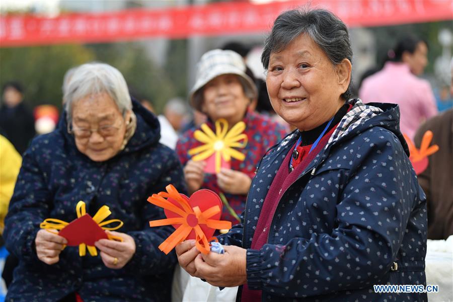 The elderly show the greeting cards they received at a community in Xi'an, northwest China's Shaanxi Province, Oct. 23, 2020. An event to greet the Senior's Day, also known as the Double Ninth Festival or the Chongyang Festival, was held in the community on Friday. (Xinhua/Zhang Bowen)