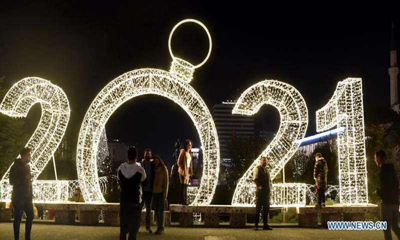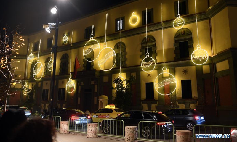 People view illuminations near Skanderbeg Square in Tirana, Albania, Nov. 24, 2020. (Xinhua/Zhang Liyun)