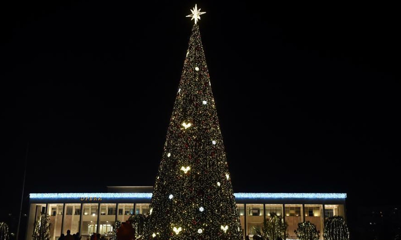 Photo taken on Nov. 24, 2020 shows an illuminated Christmas tree at Skanderbeg Square in Tirana, Albania. (Xinhua/Zhang Liyun)