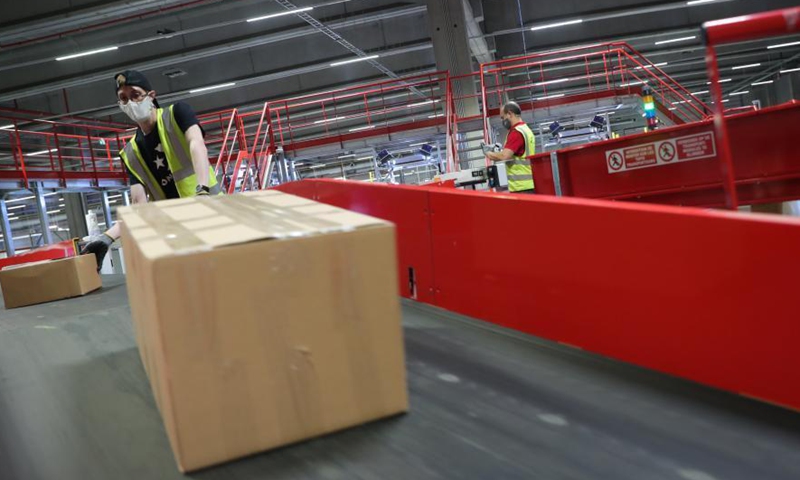Members of staff work at a sorting center of Bpost, the Belgian postal service, in Brussels, Belgium, Nov. 26, 2020. Belgium is currently under strict lockdown measures against the COVID-19 pandemic, as all non-essential businesses are closed. As the Black Friday and Christmas season approaches, Bpost faces increasing amount of parcels due to the rising demand of e-commerce.Photo:Xinhua