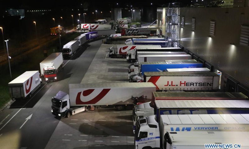 Trucks are seen outside a sorting center of Bpost, the Belgian postal service, in Brussels, Belgium, Nov. 26, 2020. Belgium is currently under strict lockdown measures against the COVID-19 pandemic, as all non-essential businesses are closed. As the Black Friday and Christmas season approaches, Bpost faces increasing amount of parcels due to the rising demand of e-commerce.Photo:Xinhua
