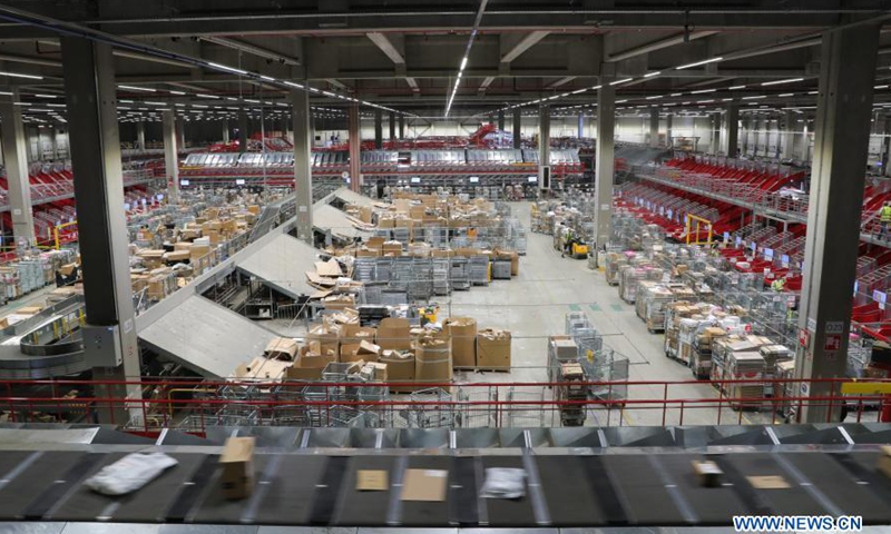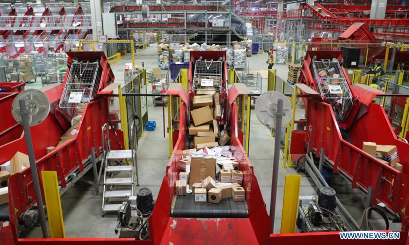 Photo taken on Nov. 26, 2020 shows a sorting center of Bpost, the Belgian postal service, in Brussels, Belgium. Belgium is currently under strict lockdown measures against the COVID-19 pandemic, as all non-essential businesses are closed. As the Black Friday and Christmas season approaches, Bpost faces increasing amount of parcels due to the rising demand of e-commerce.Photo:Xinhua