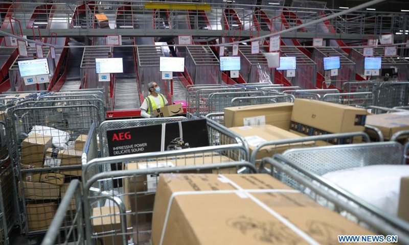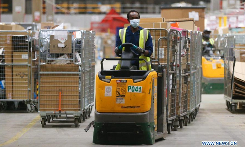 A member of staff works at a sorting center of Bpost, the Belgian postal service, in Brussels, Belgium, Nov. 26, 2020. Belgium is currently under strict lockdown measures against the COVID-19 pandemic, as all non-essential businesses are closed. As the Black Friday and Christmas season approaches, Bpost faces increasing amount of parcels due to the rising demand of e-commerce.Photo:Xinhua