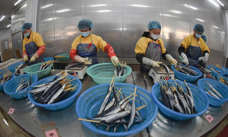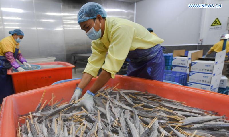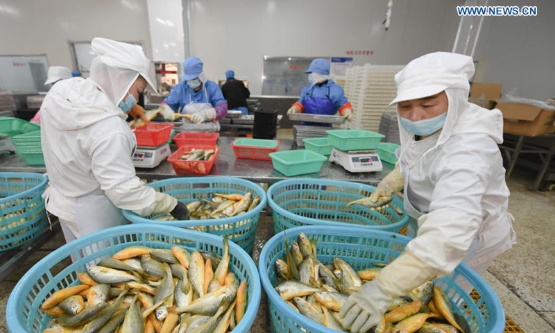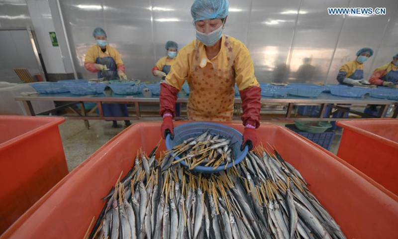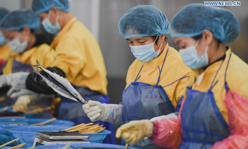 Workers process fish in a company in Sansha Town, Xiapu County of southeast China's Fujian Province, Nov. 26, 2020. By optimizing export procedures, Xiapu has reduced the average time for export tax refund to less than five working days, which effectively helps export companies function better.Photo:Xinhua