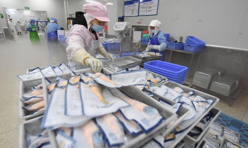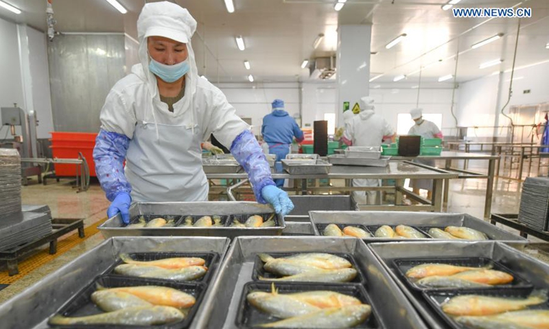 Workers pack fish to be exported to the United States in a company in Sansha Town, Xiapu County of southeast China's Fujian Province, Nov. 26, 2020. By optimizing export procedures, Xiapu has reduced the average time for export tax refund to less than five working days, which effectively helps export companies function better.Photo:Xinhua