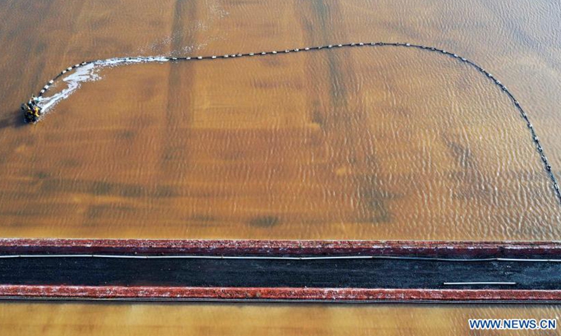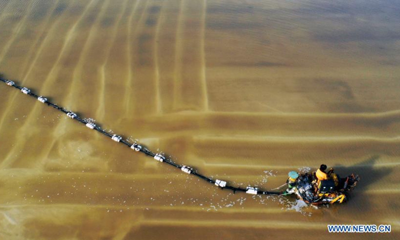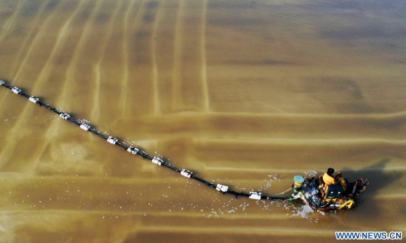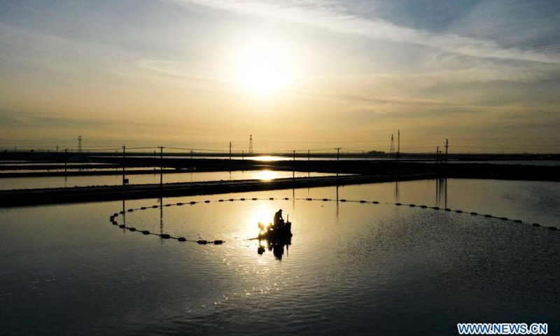 Aerial photo taken on Nov. 28, 2020 shows an employee working in the Changlu Daqinghe saltworks in Tangshan City, north China's Hebei Province.Photo:Xinhua
