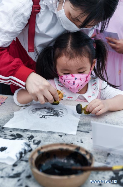 A girl experiences traditional Chinese rubbing technique at Shenzhen Library during the Shenzhen Reading Month in Shenzhen, south China's Guangdong Province, Nov. 28, 2020. The Shenzhen Reading Month has been held each November since 2000, causing UNESCO to name the city a global model for the promotion of reading. This year's event aims to promote its development vitality and cultural charm, according to the organizers. (Xinhua/Mao Siqian)