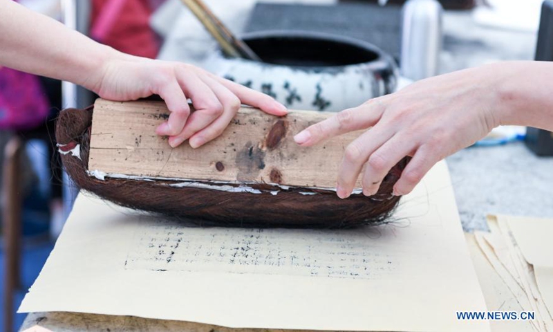 People experience Chinese woodblock printing technique at Shenzhen Library during the Shenzhen Reading Month in Shenzhen, south China's Guangdong Province, Nov. 28, 2020. The Shenzhen Reading Month has been held each November since 2000, causing UNESCO to name the city a global model for the promotion of reading. This year's event aims to promote its development vitality and cultural charm, according to the organizers. (Xinhua/Mao Siqian)