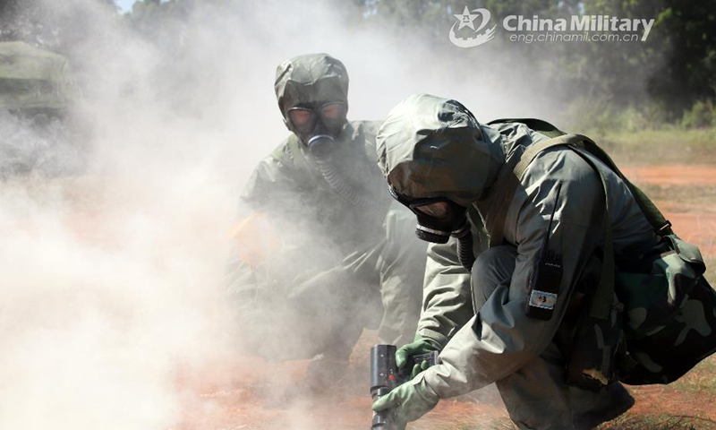 Soldiers in Mission-Oriented Protective Posture (MOPP) gears use the chemical agent detector to locate the simulated toxic agents in the soil. The realistic training exercise is carried out by a chemical defense battalion with the navy under the PLA Southern Theater Command in late October. (eng.chinamil.com.cn/Photo by Gao Zhihong)