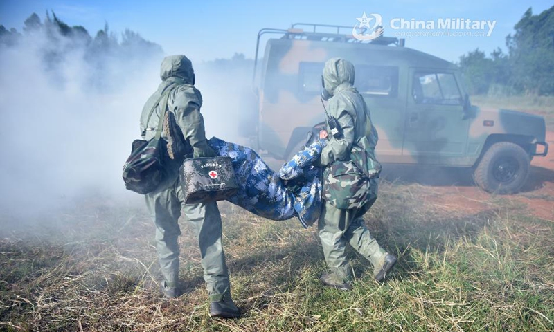 Medical staffs move the wounded to safe place in a simulated battlefield during a chemical defense training exercise. The realistic training exercise is carried out by a chemical defense battalion with the navy under the PLA Southern Theater Command in late October. (eng.chinamil.com.cn/Photo by Gao Zhihong)