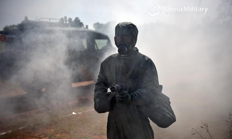Soldiers in Mission-Oriented Protective Posture (MOPP) gears operate the equipment for decontamination of military vehicles. The realistic training exercise is carried out by a chemical defense battalion with the navy under the PLA Southern Theater Command in late October. (eng.chinamil.com.cn/Photo by Gao Zhihong)