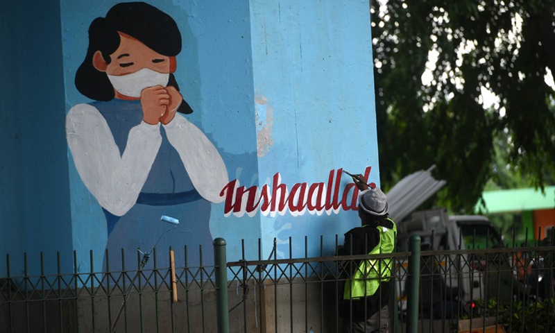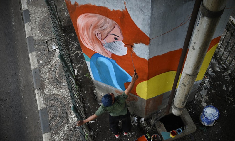 An Indonesian artist paints a mural as part of a campaign to raise awareness of COVID-19 prevention in Jakarta, Indonesia, Dec. 1, 2020.(Photo: Xinhua)