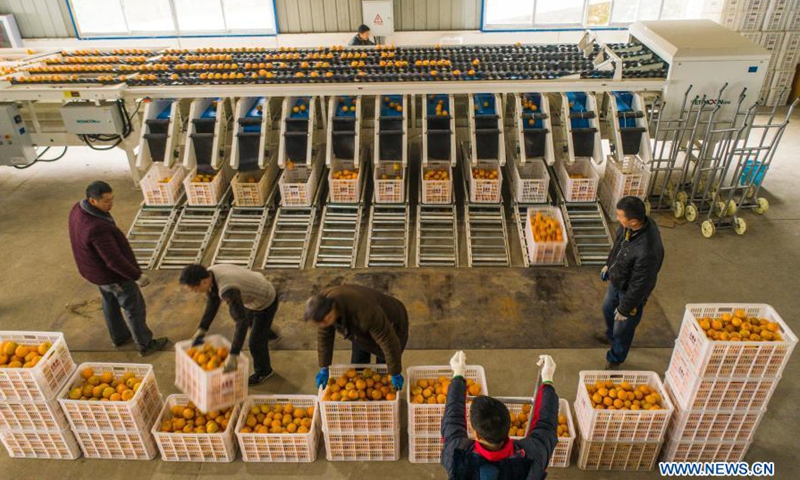 Aerial photo shows staff members sorting navel oranges at an e-commerce company in Zigui County, central China's Hubei Province, Dec. 5, 2020. The county has entered navel orange harvest season. Local e-commerce companies use online live-streaming platforms to show consumers the orange's whole handling processes including picking, carrying, sorting and packing, to help nearly 200,000 orange planters improve incomes.Photo:Xinhua