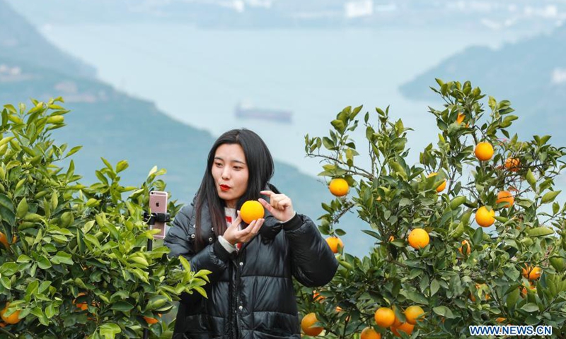 An e-commerce livestreamer promotes navel oranges at an orange plantation in Leigutai Village of Guojiaba Township in Zigui County, central China's Hubei Province, Dec. 4, 2020. The county has entered navel orange harvest season. Local e-commerce companies use online live-streaming platforms to show consumers the orange's whole handling processes including picking, carrying, sorting and packing, to help nearly 200,000 orange planters improve incomes.Photo:Xinhua