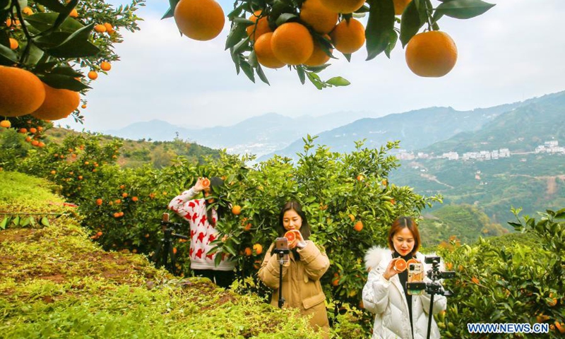 E-commerce livestreamers promote navel oranges at an orange plantation in Leigutai Village of Guojiaba Township in Zigui County, central China's Hubei Province, Dec. 4, 2020. The county has entered navel orange harvest season. Local e-commerce companies use online live-streaming platforms to show consumers the orange's whole handling processes including picking, carrying, sorting and packing, to help nearly 200,000 orange planters improve incomes.Photo:Xinhua