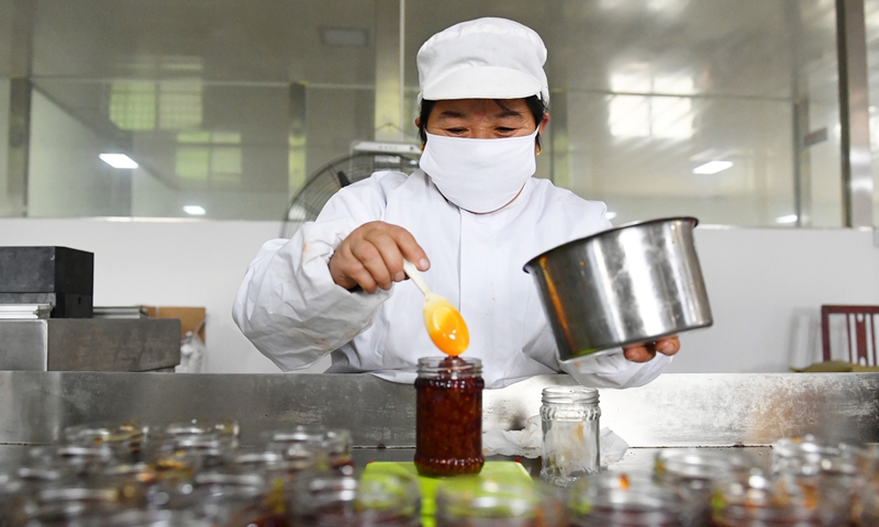 A worker packages chili sauce at a food factory in Chenzhuang village, Central China's Henan Province on Saturday. In recent years, the village opened eight workshops for labor-intensive manufacturing such as chili sauce and gift bags to help poverty-stricken villagers improve their lives. Photo: cnsphoto