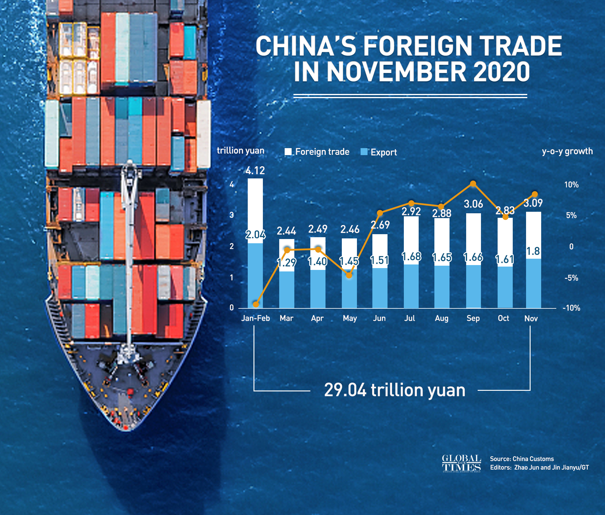 “The November foreign trade figures are in line with a continued rebounding trend seen since summer, as China's major trading partners, from Asian countries and the EU to the US have posted better-than-expected readings in economic growth,” Chen Fengying, a research fellow at the China Institutes of Contemporary International Relations, told the Global Times on Monday.