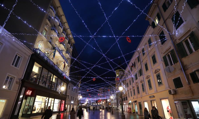 Photo taken on Dec. 7, 2020 shows Christmas decorations in Rijeka, Croatia. (Goran Kovacic/Pixsell via Xinhua)