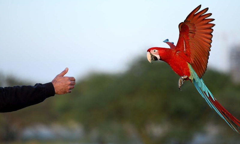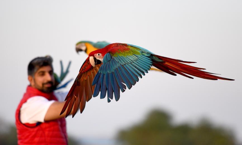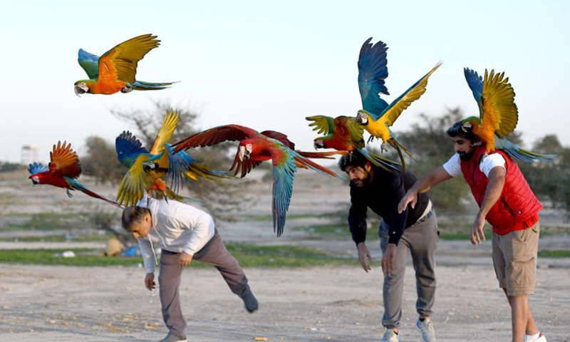 People train parrots during a parrot-training show held by Kuwaiti bird lovers in Jahra Governorate, Kuwait, Dec. 7, 2020. (Photo by Ghazy Qaffaf/Xinhua)