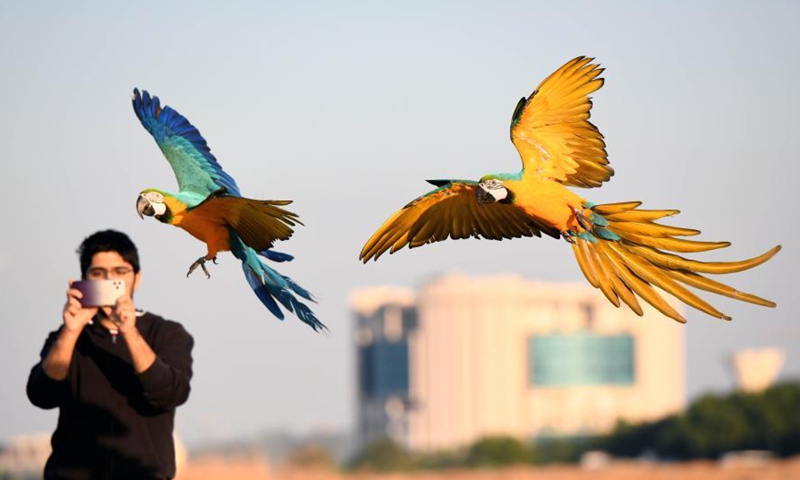 A man takes photo of parrots during a parrot-training show held by Kuwaiti bird lovers in Jahra Governorate, Kuwait, Dec. 7, 2020. (Photo by Ghazy Qaffaf/Xinhua)