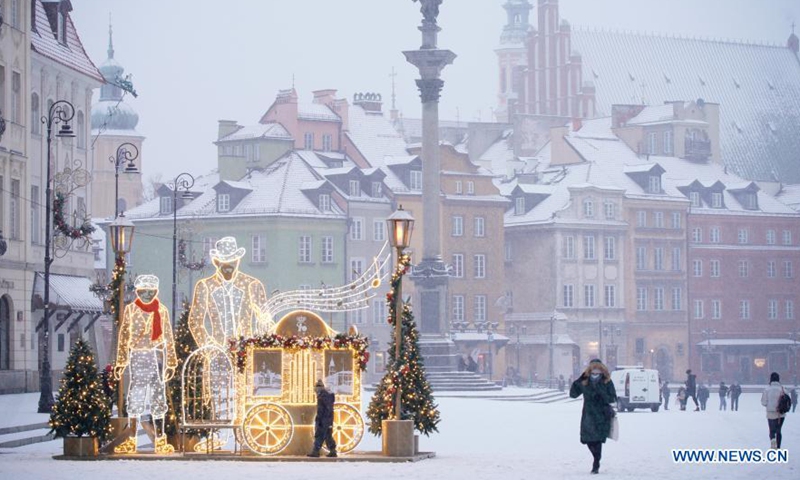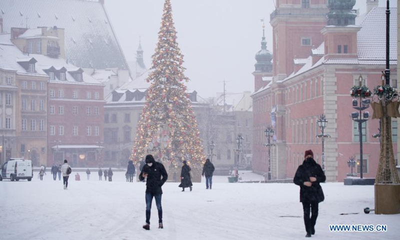People walk in the Old Town during the first snowfall in Warsaw, Poland on Dec. 10, 2020. The first snow of this year fell upon Warsaw Thursday. (Photo by Jaap Arriens/Xinhua)