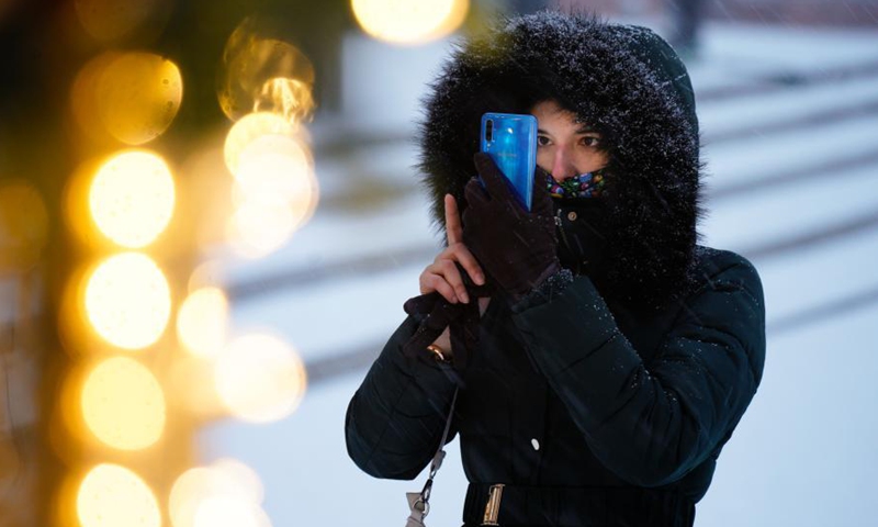 A woman takes a photo with mobile phone of Christmas decorations in the Old Town in Warsaw, Poland on Dec. 10, 2020. The first snow of this year fell upon Warsaw Thursday. (Photo by Jaap Arriens/Xinhua)