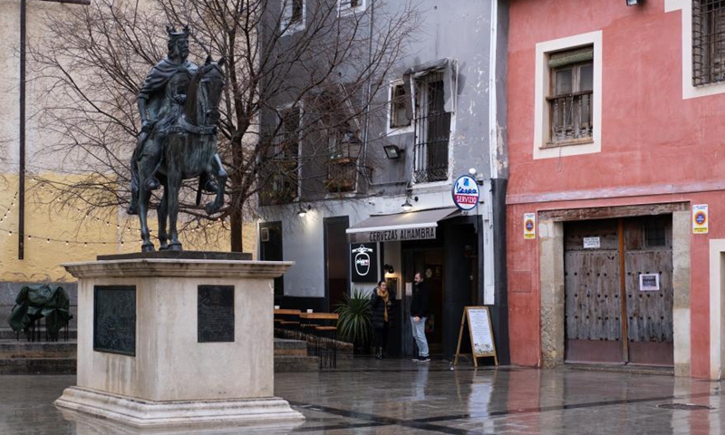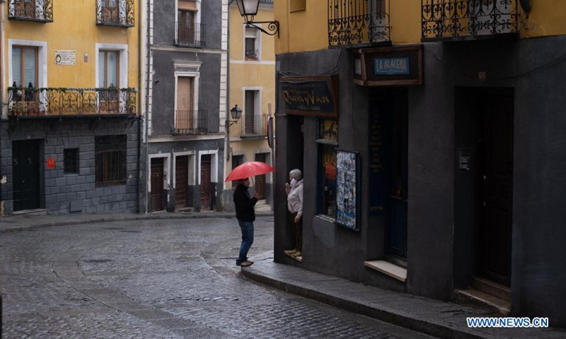 People chat on the street in Cuenca, Spain, Dec. 11, 2020. As a world heritage site, Cuenca is renowned for its abundant historical buildings. (Xinhua/Meng Dingbo)