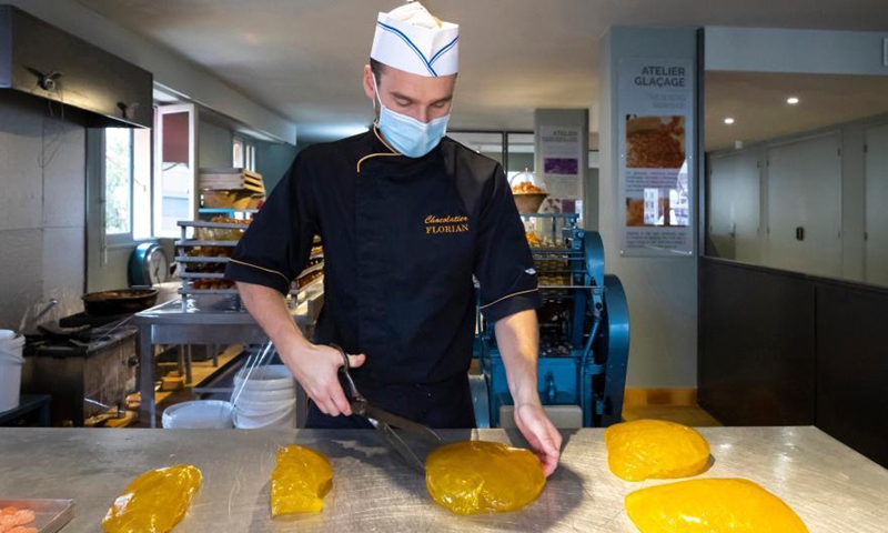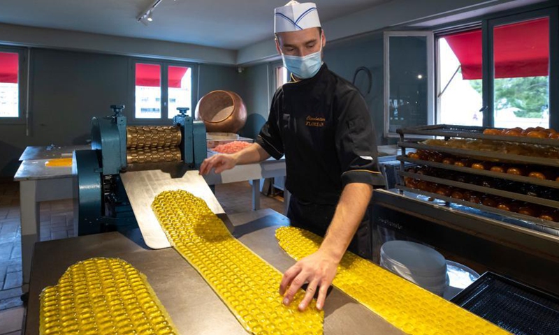 A confectioner makes candies at a candy shop in Nice, France, Dec. 12, 2020. (Xinhua)
