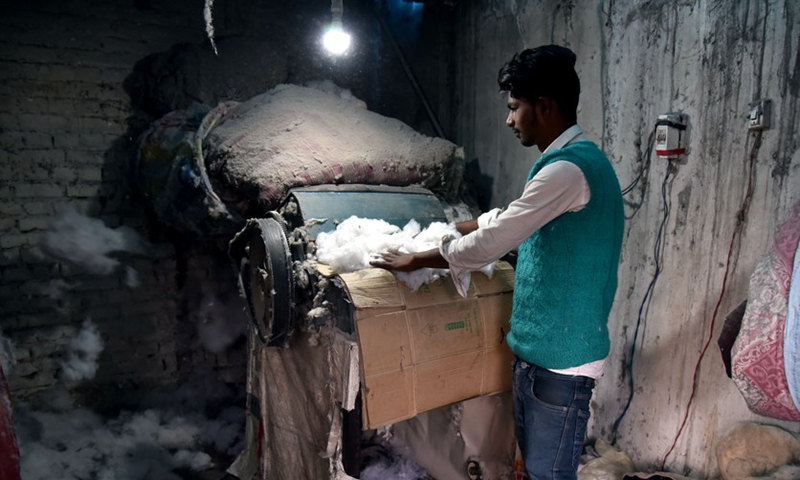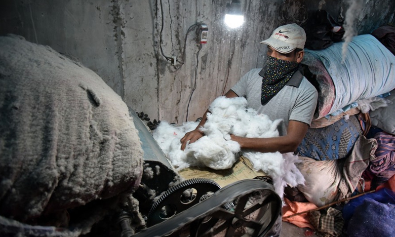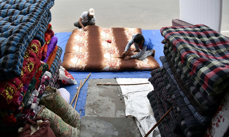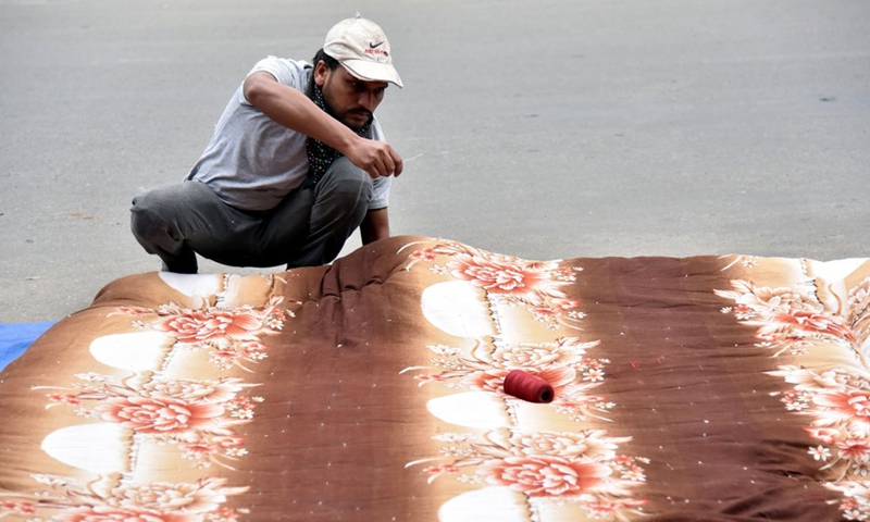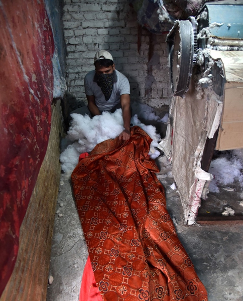 A worker makes a quilt at a workshop to meet the rising demand in winter on the outskirts of Jammu, the winter capital of Indian-controlled Kashmir, Dec. 13, 2020. (Str/Xinhua)