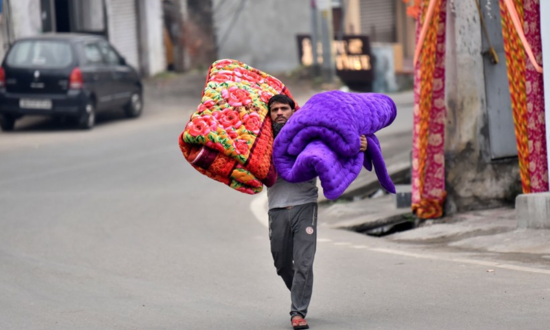 A worker carries quilts to sell on the outskirts of Jammu, the winter capital of Indian-controlled Kashmir, Dec. 13, 2020. (Str/Xinhua)
