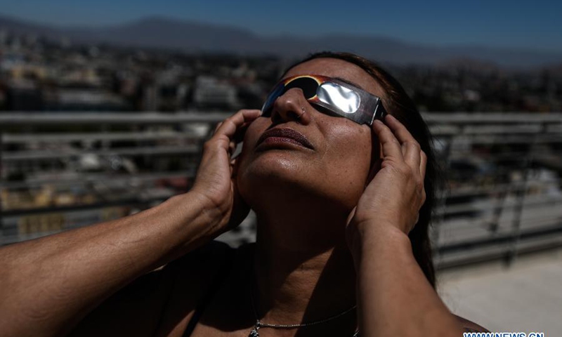 A woman observes a total solar eclipse through a goggle in Panguipulli, Los Rios Region, Chile, Dec. 14, 2020. (Xinhua)